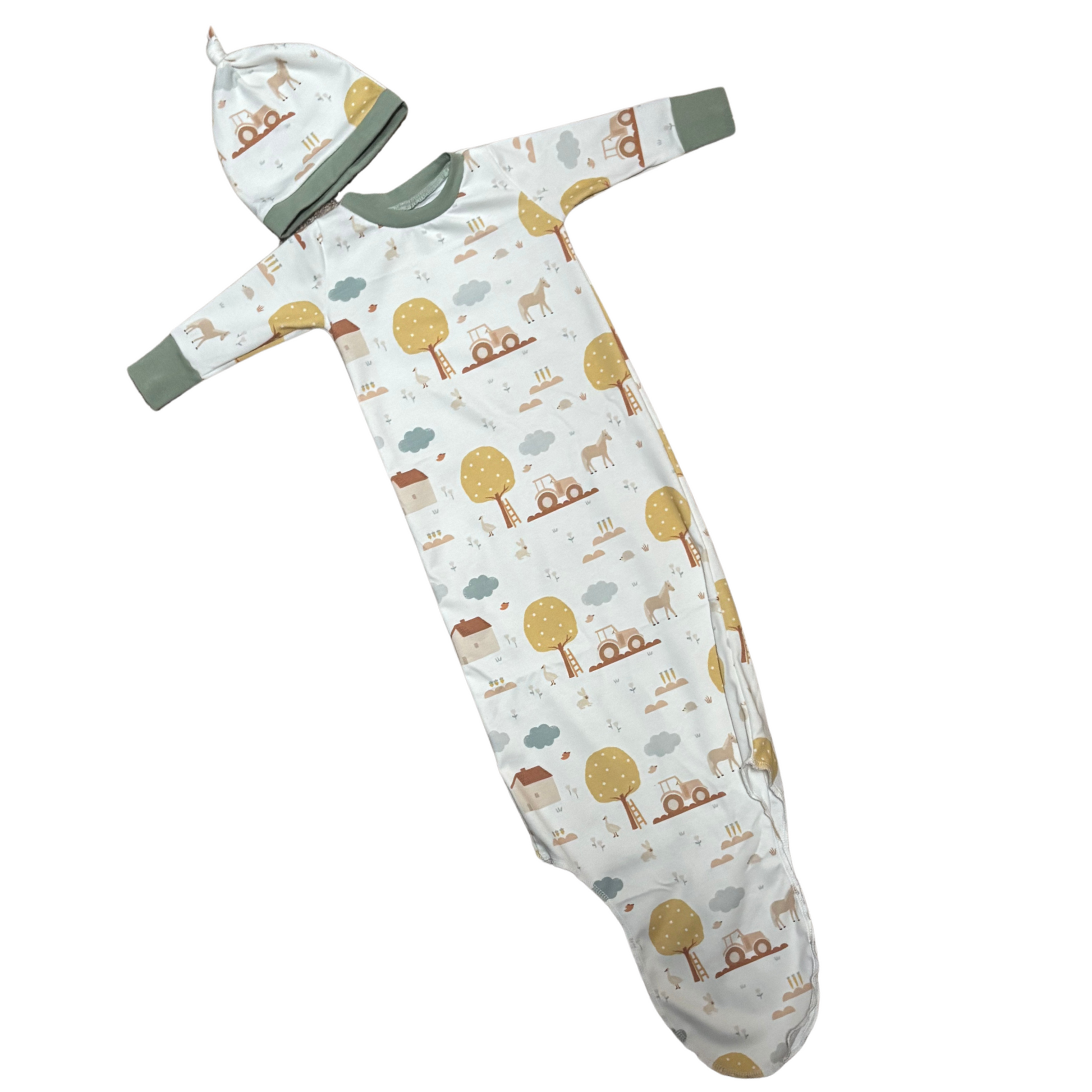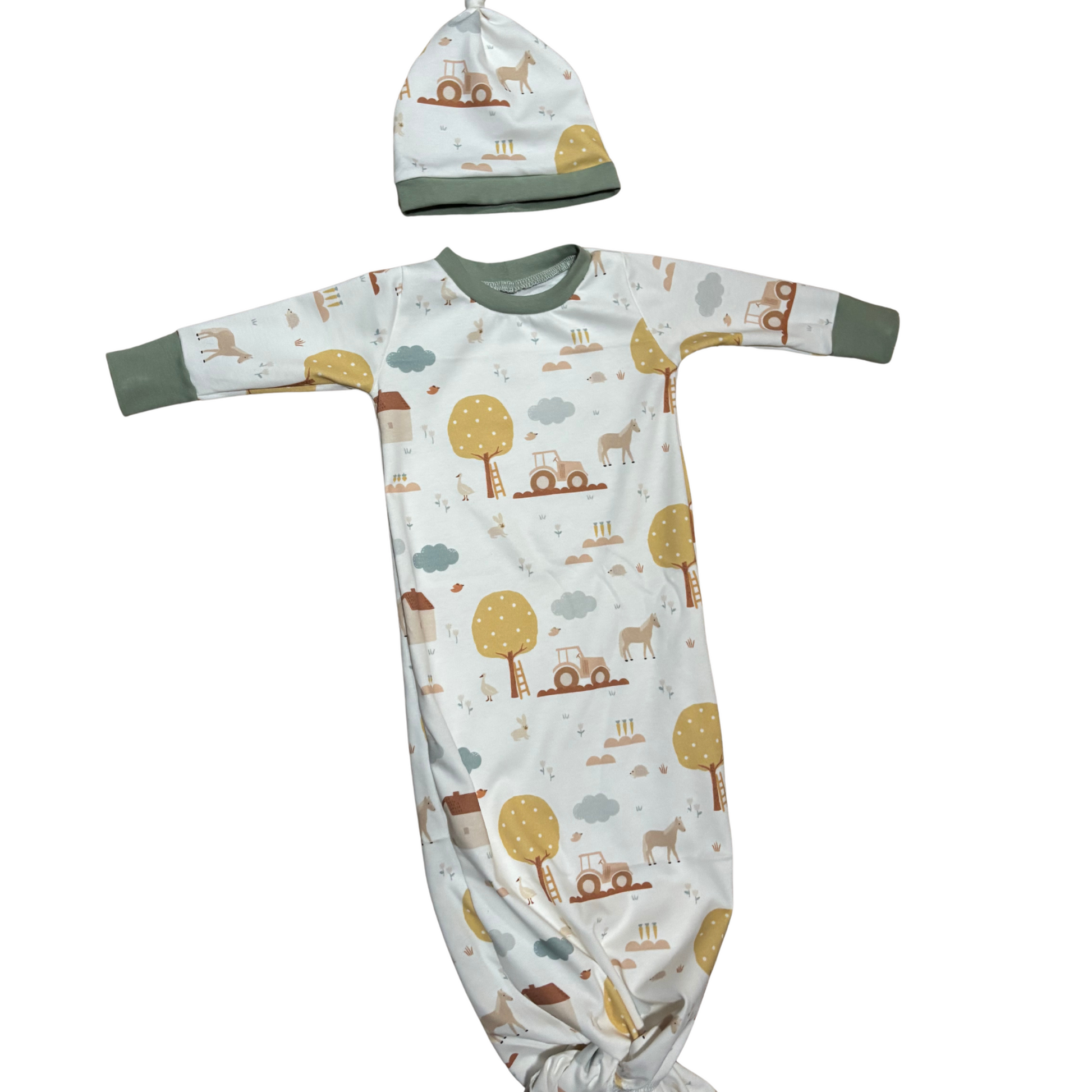 Soft and adorable knotted gown and hat set featuring a cute farm scene.