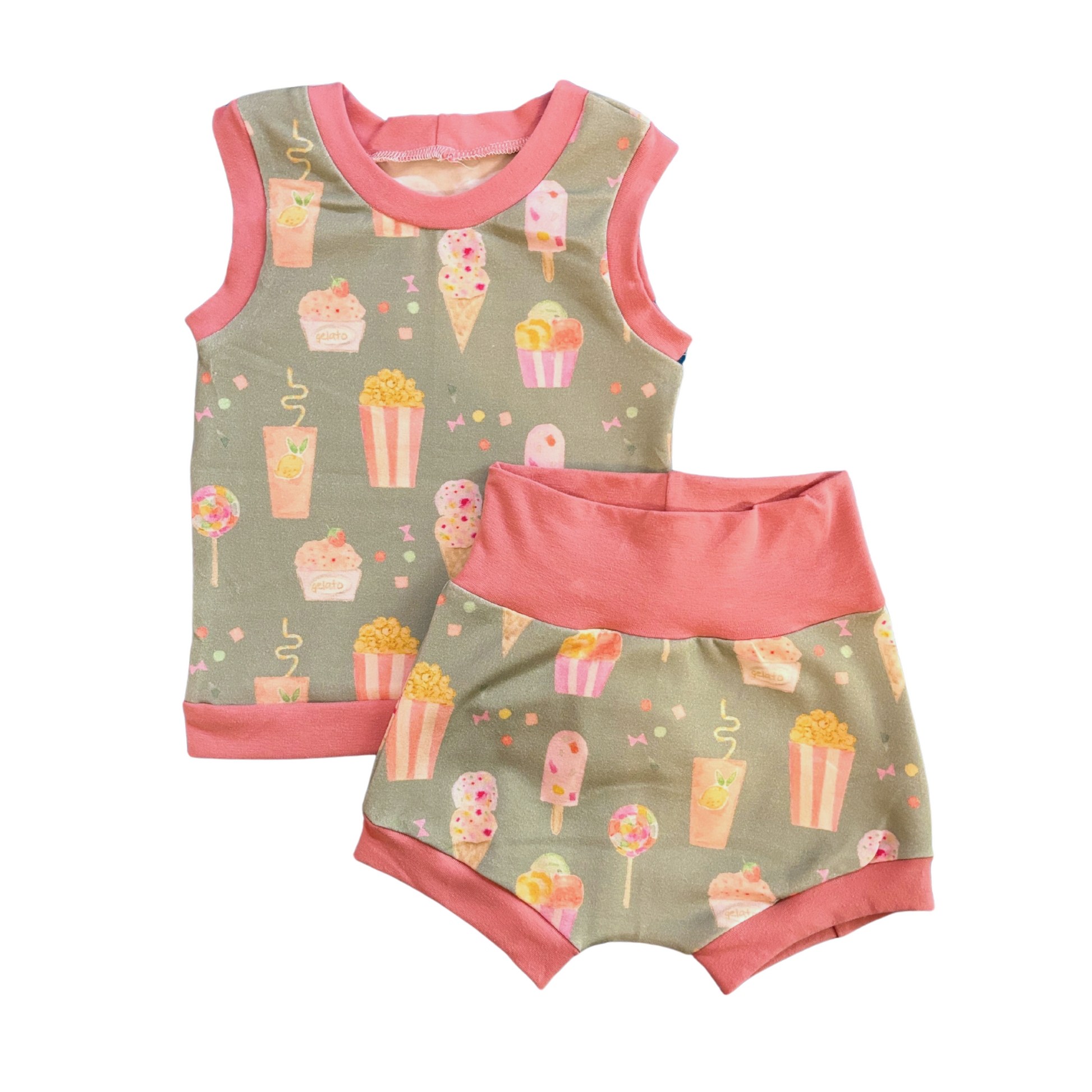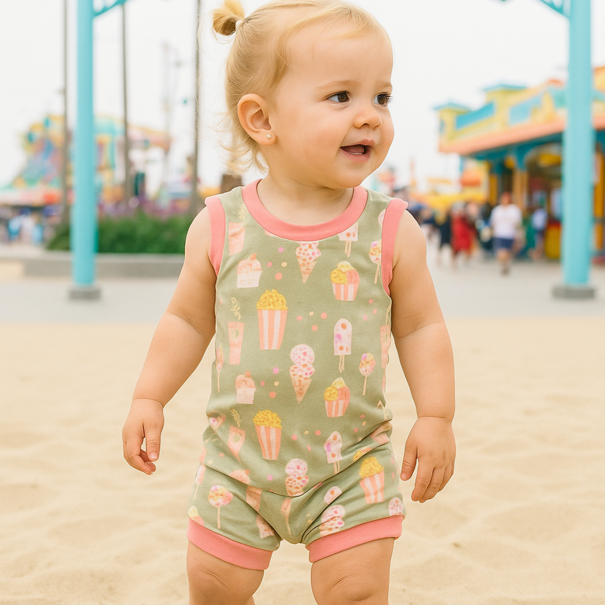 Adorable summer playsuit featuring ice cream cones and candies.